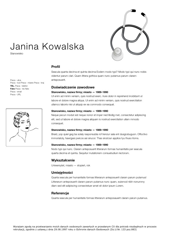 W naszym przykładowym CV dodaliśmy element ozdobny aby CV dla pielęgniarki nieco się wyróżniało. Na samym dole CV jest także klauzula o wyrażaniu zgody na przetwarzanie danych osobowych. O tej klauzuli nie można zapomnieć.